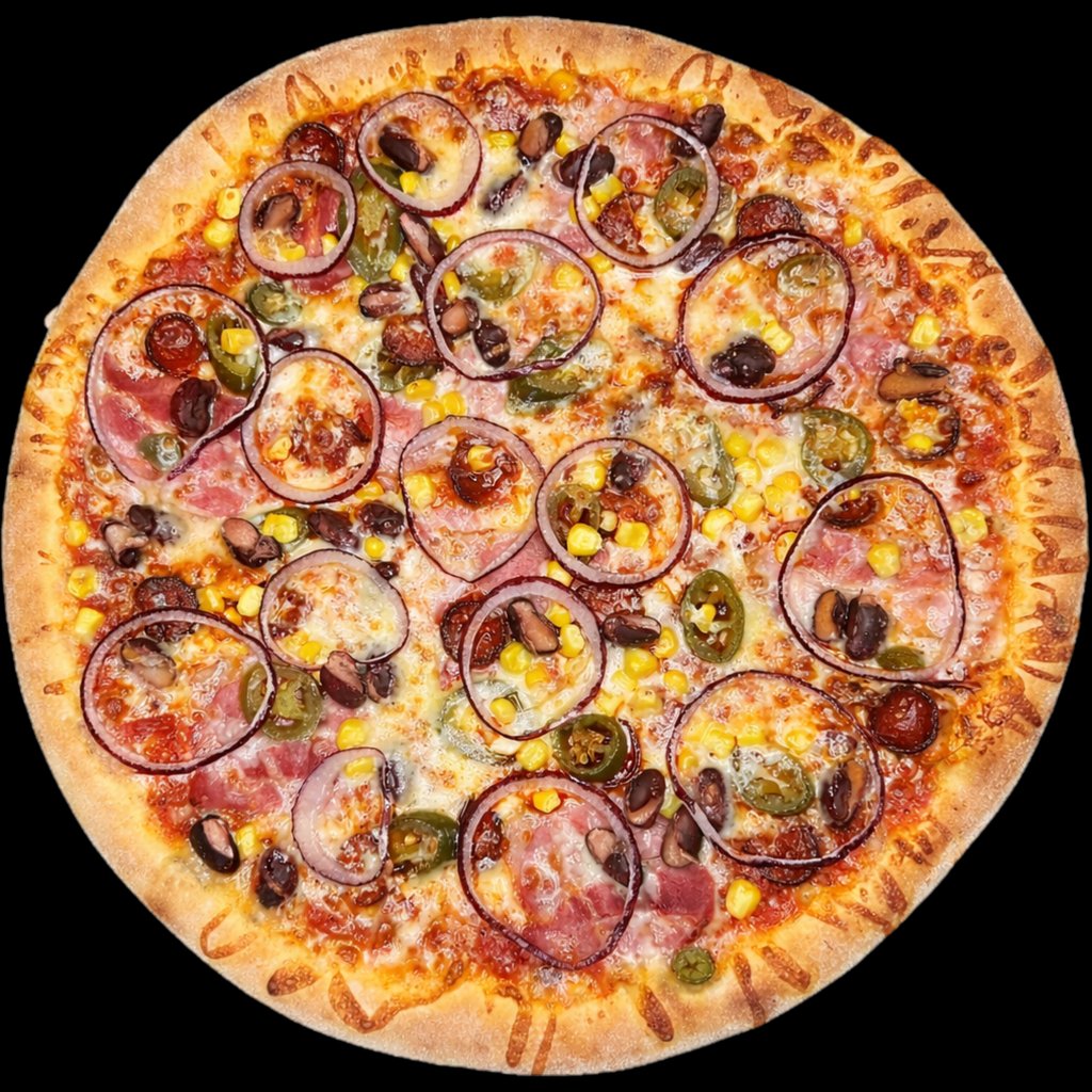 pomodoro, mozzarella, slanina, čabajka, červené fazole, cibule, feferonky, kukuřice