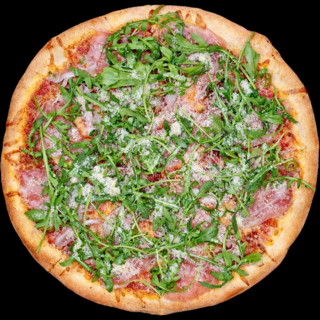 tomat, mozzarella, olivy, sušené rajčata, parmská šunka, rukola, parmezán