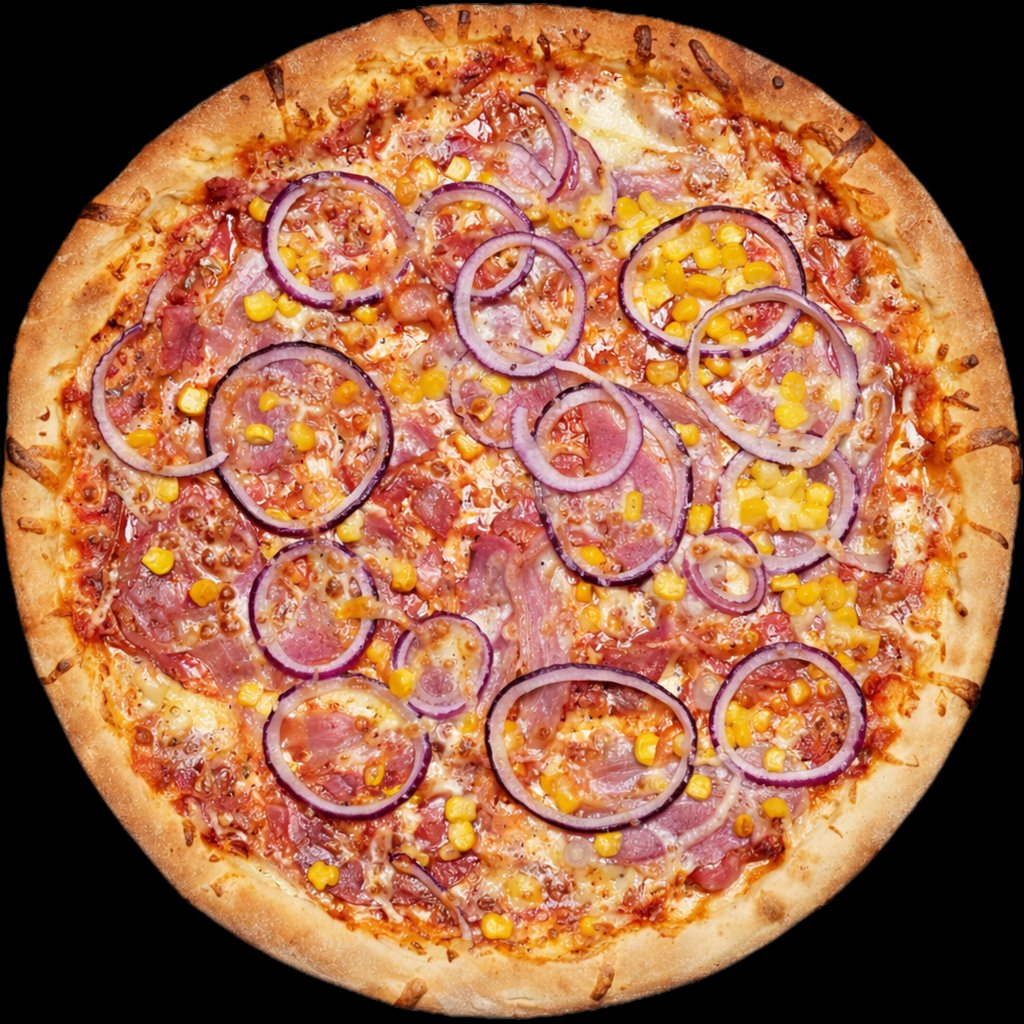 pomodoro, mozzarella, ventricina, slanina, kukuřice, cibule, sýrové okraje