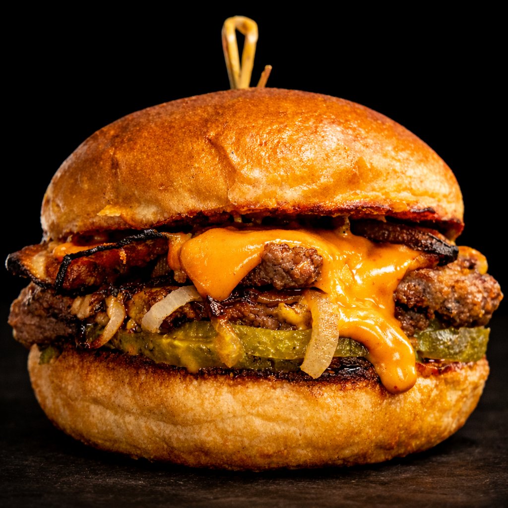 2x80g smashnutýho hovězího masa s cibulkou, 2x cheddar, slanina, nakládaná okurka, tajná Missisippi omáčka a to vše v naší domácí bulce