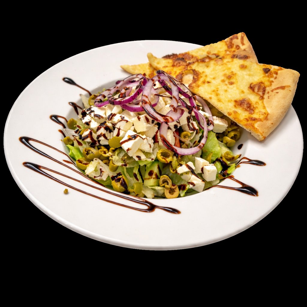 300g Fresh salát, balkánský sýr, olivy, cibule, olivový olej, balsamicco, 1/4 pizza chléb