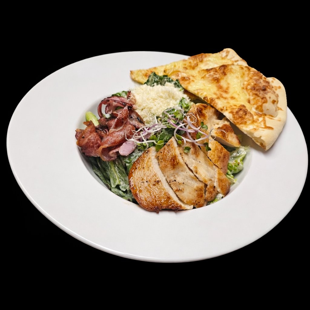 300g Římský salát, grilované kuřecí maso, slaninový chips, parmezán, caesar dresing, 1/4 pizza chléb