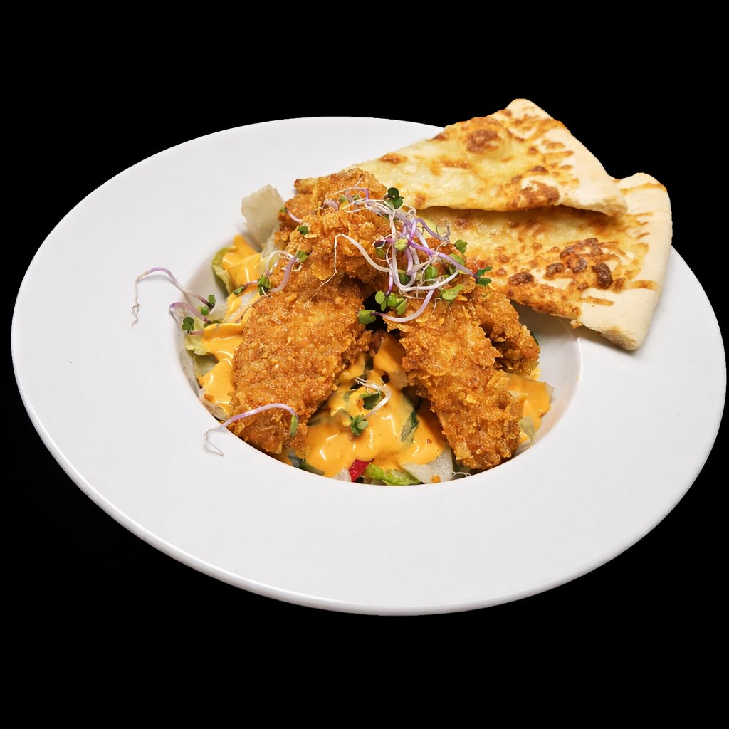 300g fresh salát, domácí smažené kuřecí stripsy, francouzský dresing, 1/4 pizza chléb