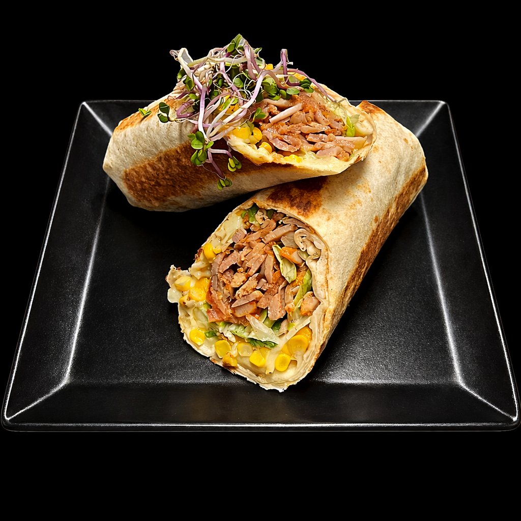 Ledový salát, kukurice, rajče, pečený gyros, smažená cibulka, tatarka