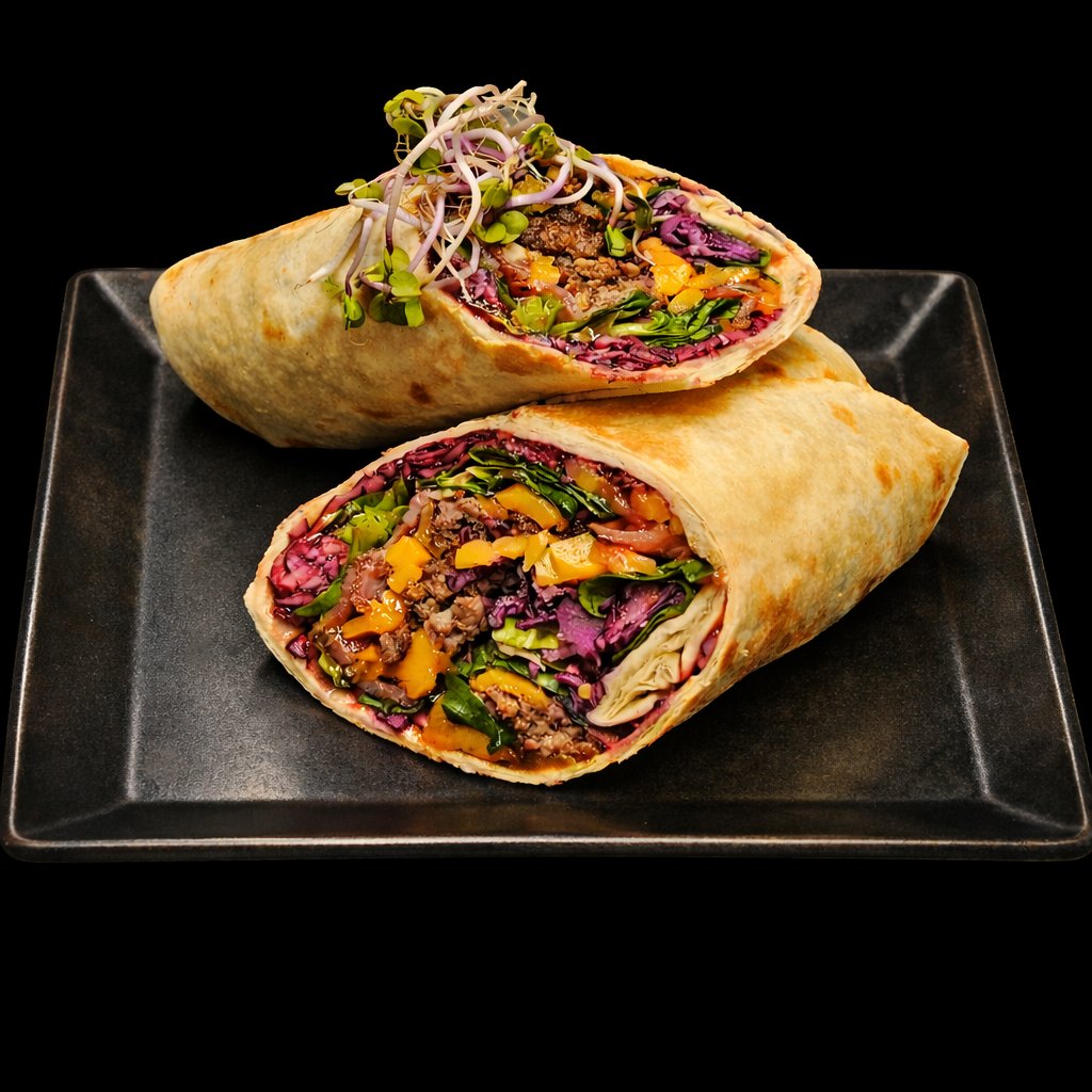 350g tortilla, mleté hovězí maso, sýr Cheddar, slanina, červená cibule, polníček, červené zelí, BBQ